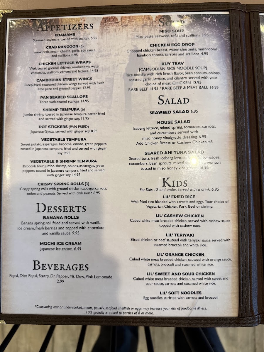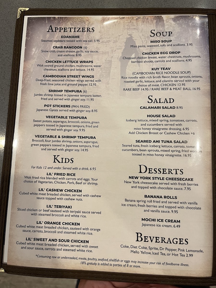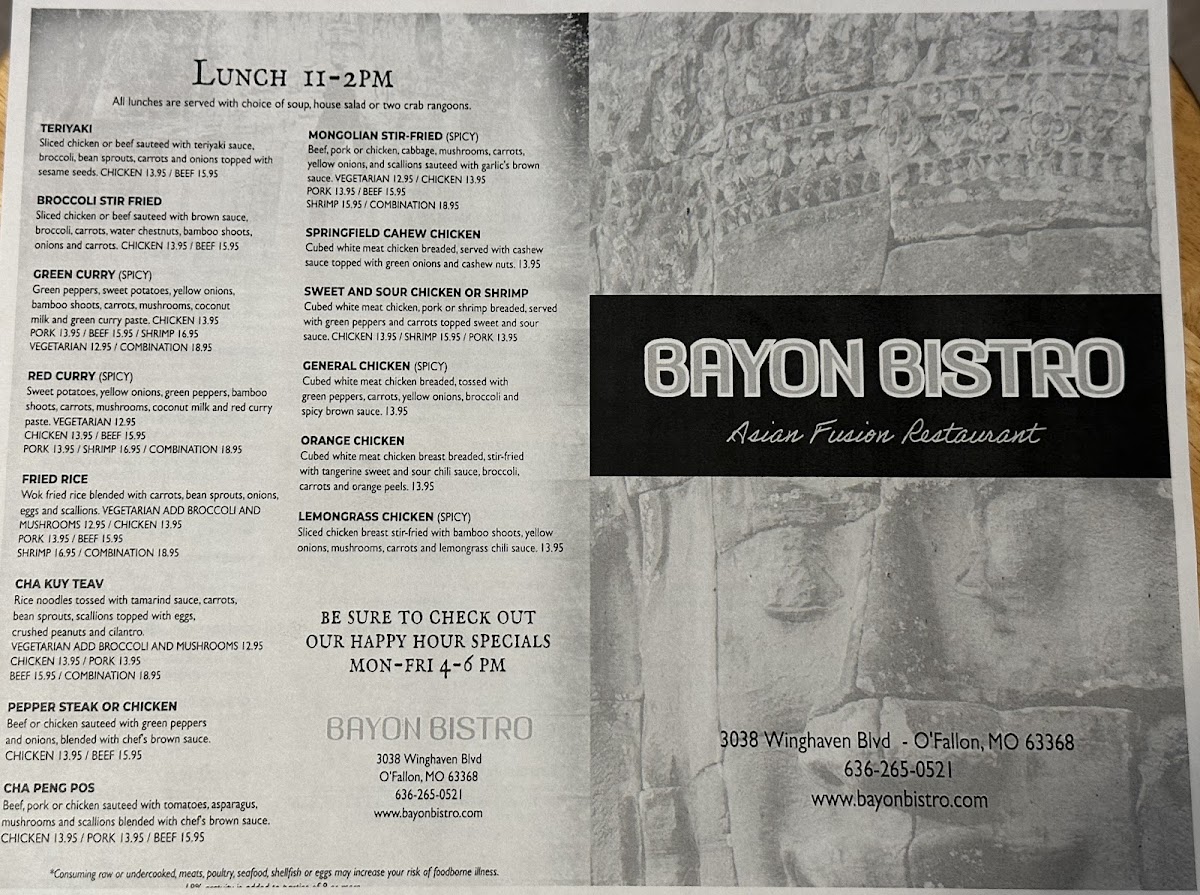 Bayon Bistro offers a thoughtfully curated menu that brings together the rich flavors of Cambodian cuisine alongside a variety of Asian influences. The menu feels approachable and balanced, ranging from comforting soups and fresh sushi to flavorful stir-fries and satisfying small plates. Whether you're stopping by for a relaxed lunch, a casual dinner, or sharing bites with friends, the dishes invite a warm, unhurried experience.